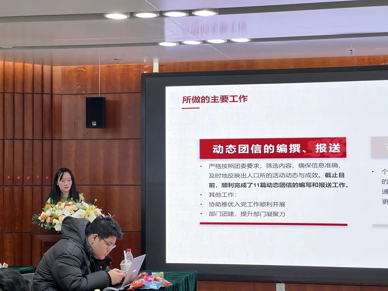 团委研究生会各部门进行了述职汇报。组织部田万宁、志愿服务部王鹏程、学术部刘郅楠、综合事务部张宇一、文体部胡清榆、宣传部叶梓怡依次总结了所属部门本阶段的工作成果与经验,提出了建设意见和未来计划。